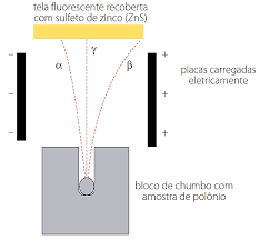 As principais emissões radioativas são chamadas de alfa (𝛂), beta (𝛃) e gama (𝛄). Apresentam grandes distinções em termos de carga e massa. A imagem abaixo mostra como elas se comportam ao atravessar um campo elétricos, ou seja, quais são suas cargas.